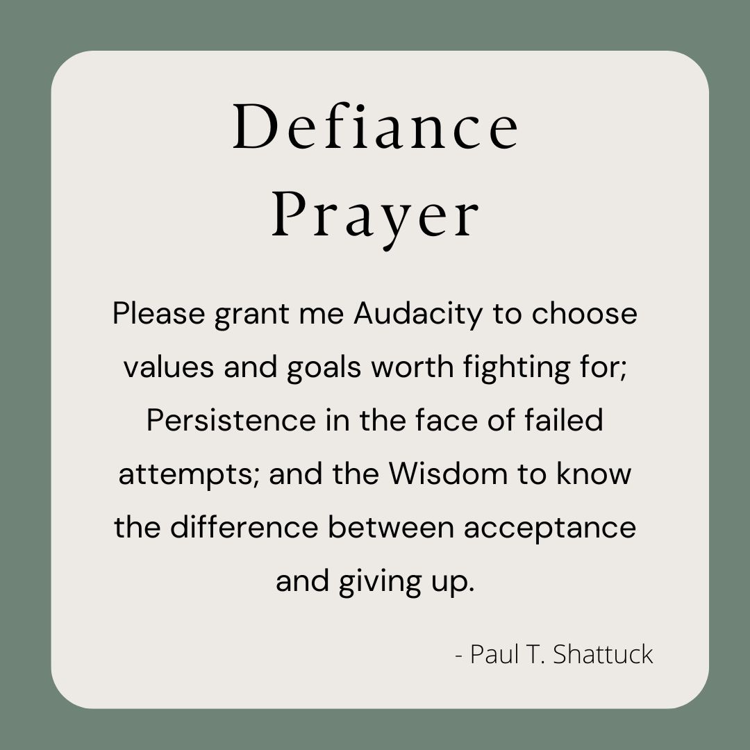I love the Defiance Prayer. We don't have to be perfect; we just have to be cognizant of what they're trying to do to us, thoughtful and gentle with ourselves about how we respond, and persistent--recognizing that we're in this for the long haul. Which has pretty much *always* been the case for people trying to make this country better.
